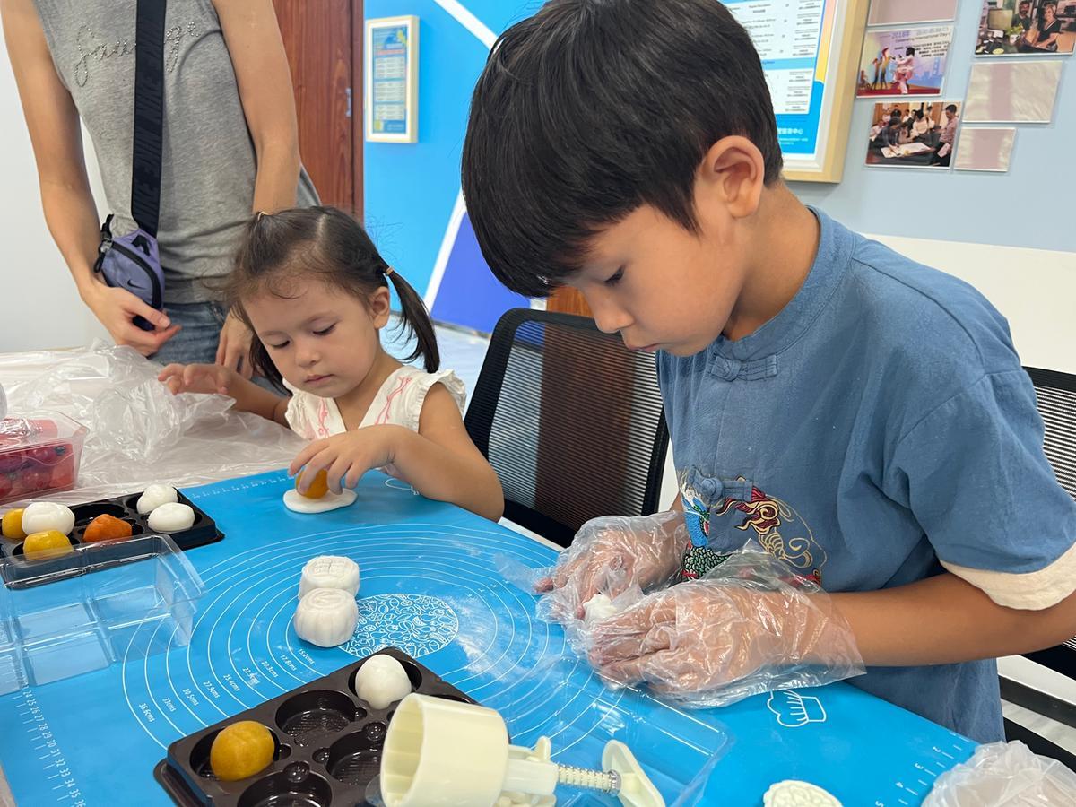 随后,大家在甜品师的指导下制作冰皮月饼,擀皮、包馅儿、揉团、压模一气呵成,不一会儿,一个个“兔子”“福”“中秋”“暴富”“花朵”等形状各异的月饼就占满了整个操作台,有的小朋友忍不住拿起一个放到嘴里,津津有味地品尝起来。