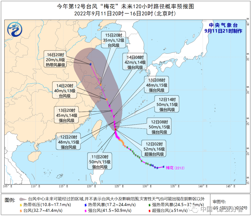 同时,预计“梅花”将于12日夜间至13日凌晨穿过琉球群岛后进入东海南部海面,逐渐向浙江东北部沿海靠近,并可能于15日登陆或擦过上述沿海地区。