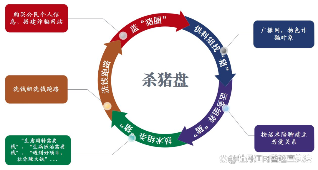 杀猪盘,是对交友婚恋类网络诈骗的一种俗称,是指诈骗分子利用网络交友,诱导投资赌博的电信诈骗方式。诈骗分子准备好人设、交友套路等“猪饲料”,将社交平台称为“猪圈”,在其中寻找被他们称为“猪”的诈骗对象,通过建立恋爱关系,即“养猪”,最后骗取钱财,即“杀猪”。