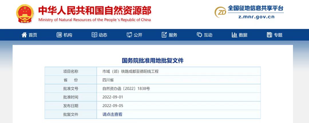 根据批复文件,市域(郊)铁路成都至德阳线工程已列入国家发展改革委2022年中央加大建设用地保障力度的国家重大项目清单。经审查,该项目用地符合规定,原则同意通过用地预审。