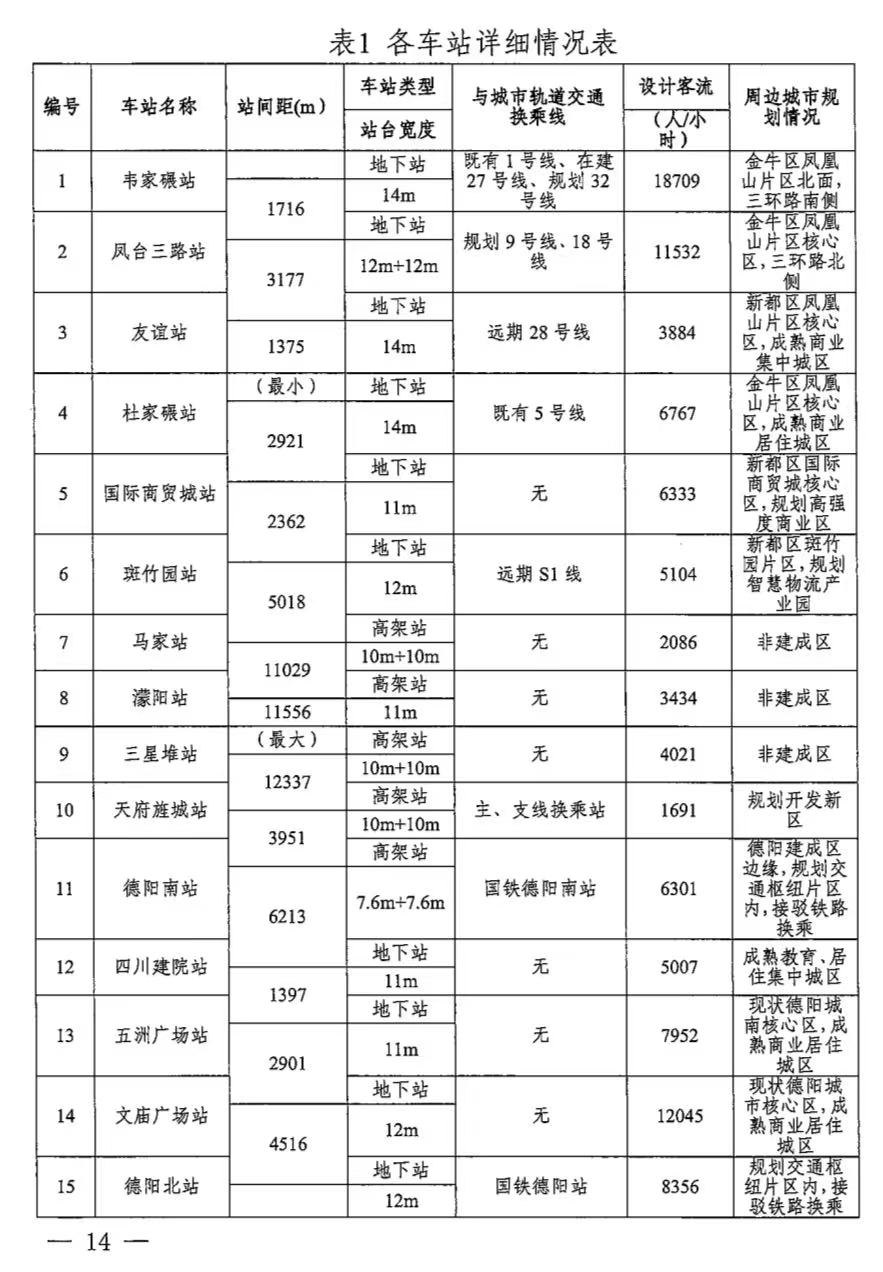 全线最大站间距位于濛阳站至三星堆站,跨越成都市与德阳市分界线,两座车站均位于非建成区,车站之间区域多为农田,考虑客流来源问题,站间距较大,中间未考虑设站。