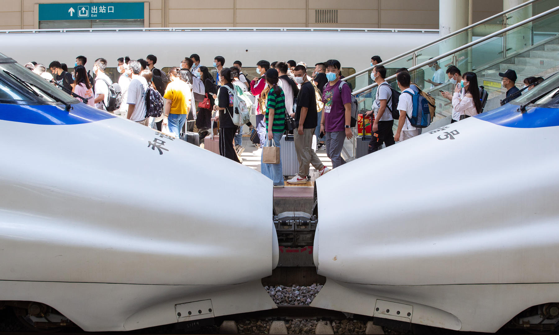 ↑2022年9月12日,南京火车站,旅客下车出站。图据视觉中国