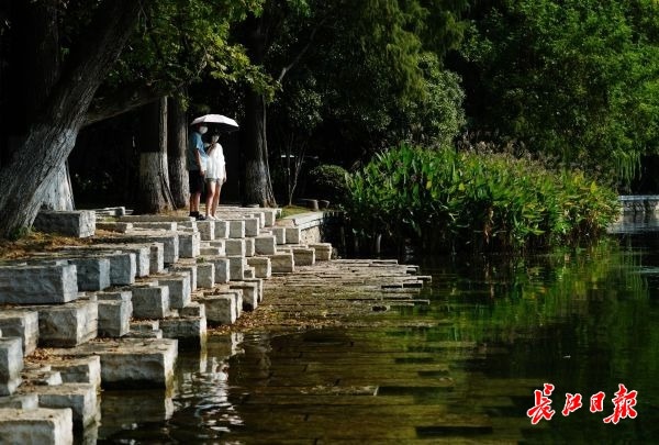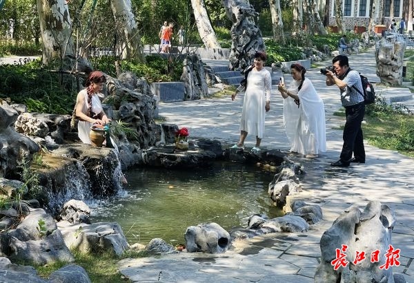 游客在全新改造后的东湖听涛景区水云湾拍照打卡。记者何晓刚 摄