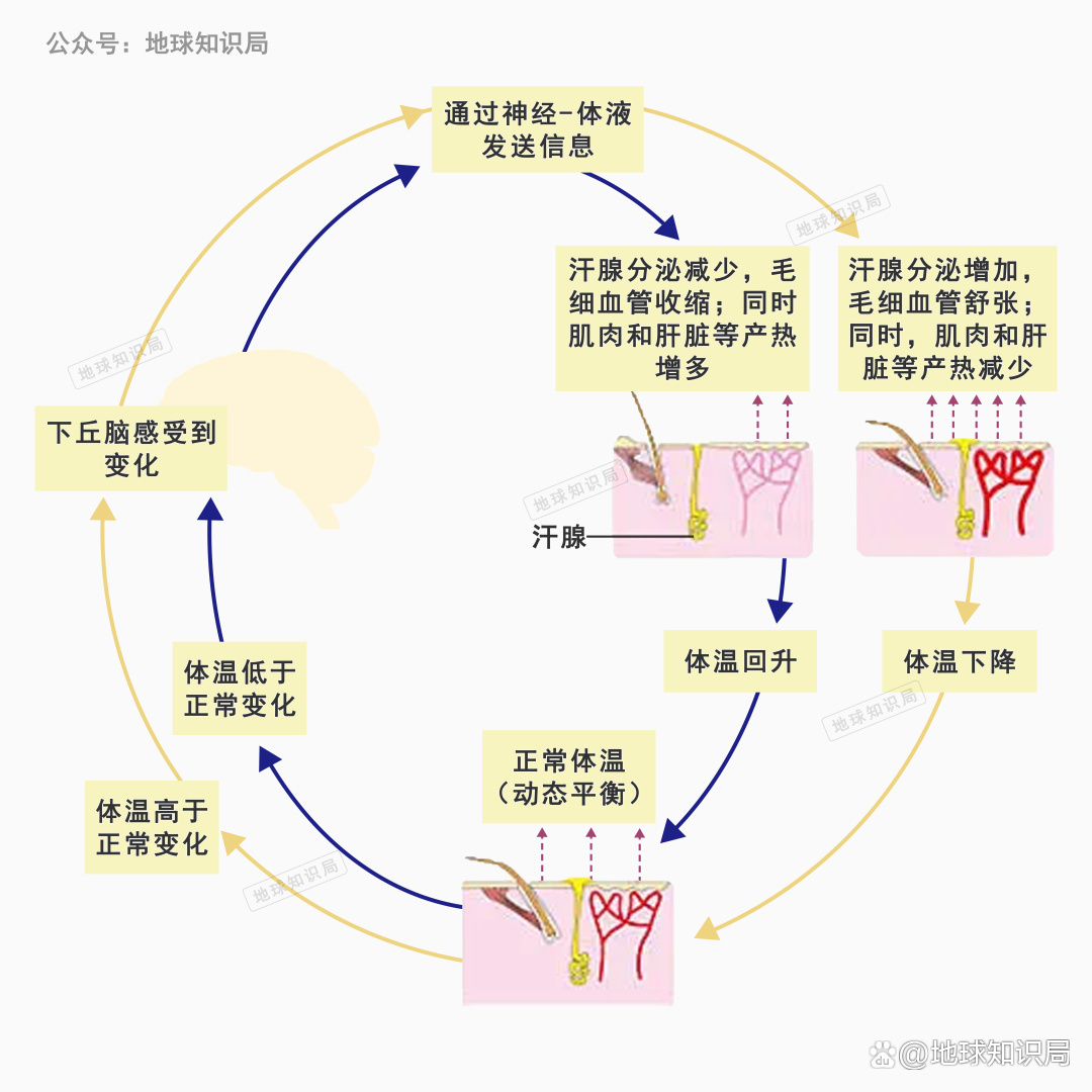 这是一个精密的自动控制系统,其最终目的是保证心脏、肺脏以及大脑等重要脏器温度的稳定。当外界环境改变时,在体温调节系统的反馈作用下,人体可以重新达到热平衡,并维持稳定的体温。