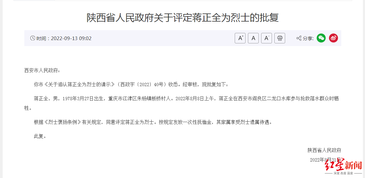 批复表示,对西安市人民政府《关于追认蒋正全为烈士的请示》(西政字〔2022〕40号)已收悉,经审核现批复如下:蒋正全,男,1978年3月27日出生,重庆市江津区朱杨镇板桥村人。2022年8月8日上午,蒋正全在西安市阎良区二龙口水库参与抢救落水群众时牺牲。