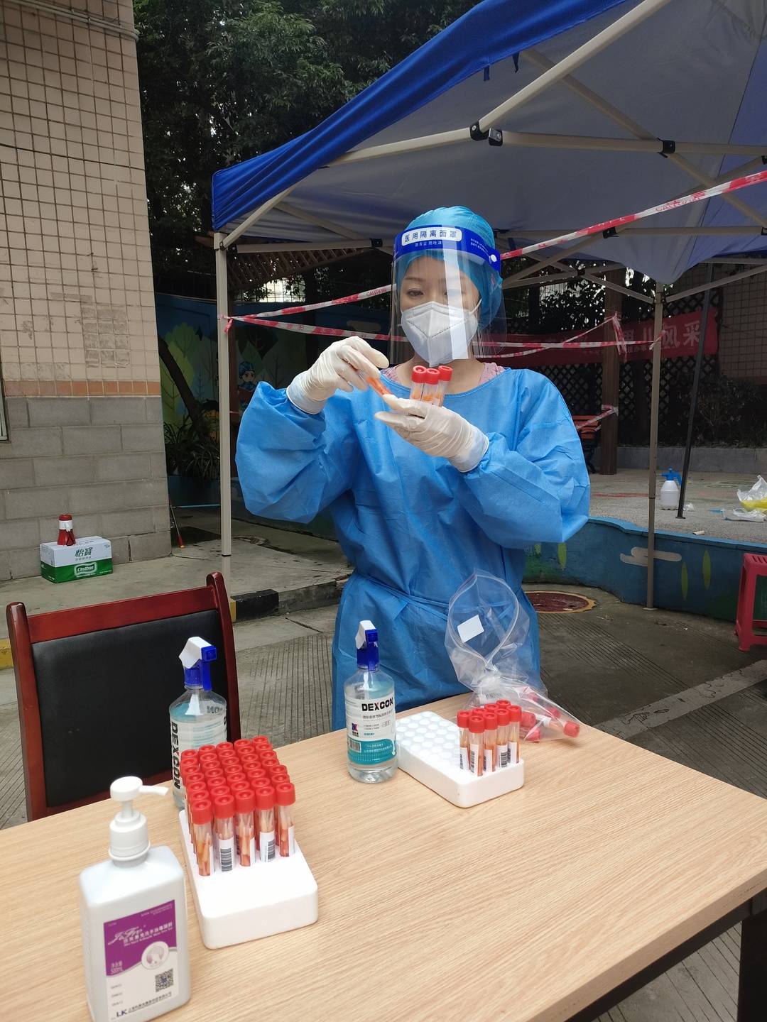 9月5日,泸定发生6.8级地震,成都的震感非常强烈,可蒲丹完全没有感觉。“我是接到儿子的电话才知道泸定发生了地震。”蒲丹回忆,当天她正要去新城市广场收核酸采样管,转运车把她送到了新城市广场的停车场,她需要步行绕到广场后面,再上6层楼才能到达采样点。当天的天气很热,一路小跑,汗水浸湿的衣服包裹在不透气的防护服里,非常难受。再加上上楼下楼,提着的采样箱“哐当哐当”,她完全没有感受到发生了地震。