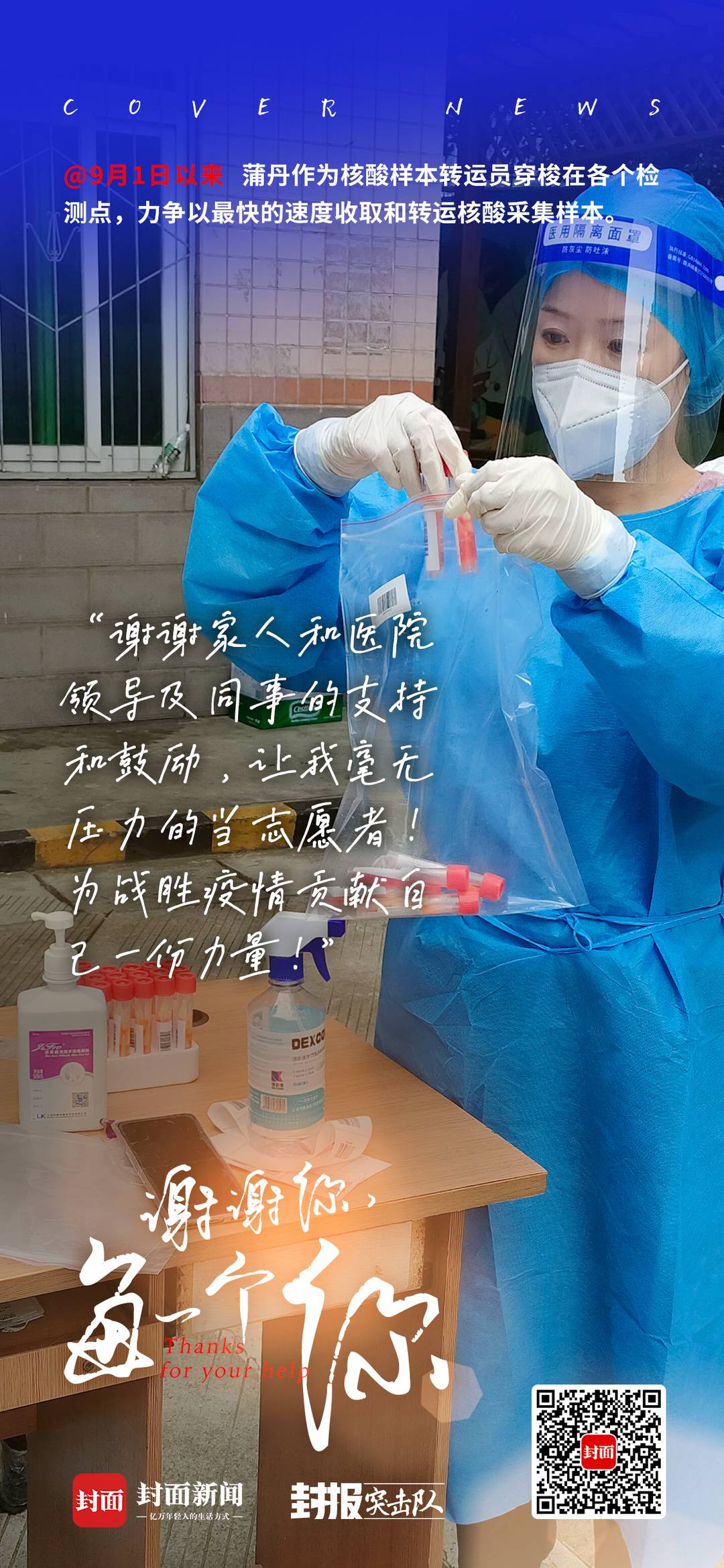 在当志愿者期间,蒲丹在八一骨科医院的本职工作也从未停下。除了每天往返青羊区宁夏社区各个采样点,负责辖区内近2万居民核酸采集样本的转运工作之外,还得兼顾单位的工作,双重工作压力之下,家庭就完全顾不上了。“疫情来了,很多家里的老人和小孩儿都没人照顾。在这个时候,作为一名共产党员,我有责任和义务站出来,为需要的百姓服务。我家里没有老人需要我照顾,我家孩子也长大了,我可以腾出闲暇的时间为疫情防控出一份力。”蒲丹表示,她当志愿者这件事,家人很支持,儿子以她为傲,但儿子也和她约法三章,叮嘱她保护好自己。除了家人之外,蒲丹表示,还有一个动力来自于自己的单位,“医院领导也非常支持我做志愿者,他们表示无论院内还是院外,这都是在为人民服务。”