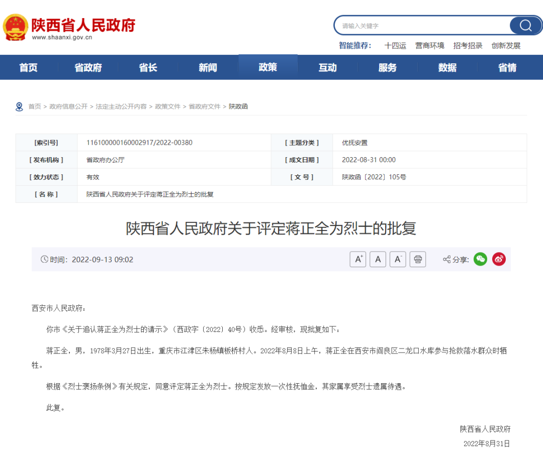 蒋正全,男,1978年3月27日出生,重庆市江津区朱杨镇板桥村人。2022年8月8日上午,蒋正全在西安市阎良区二龙口水库参与抢救落水群众时牺牲。