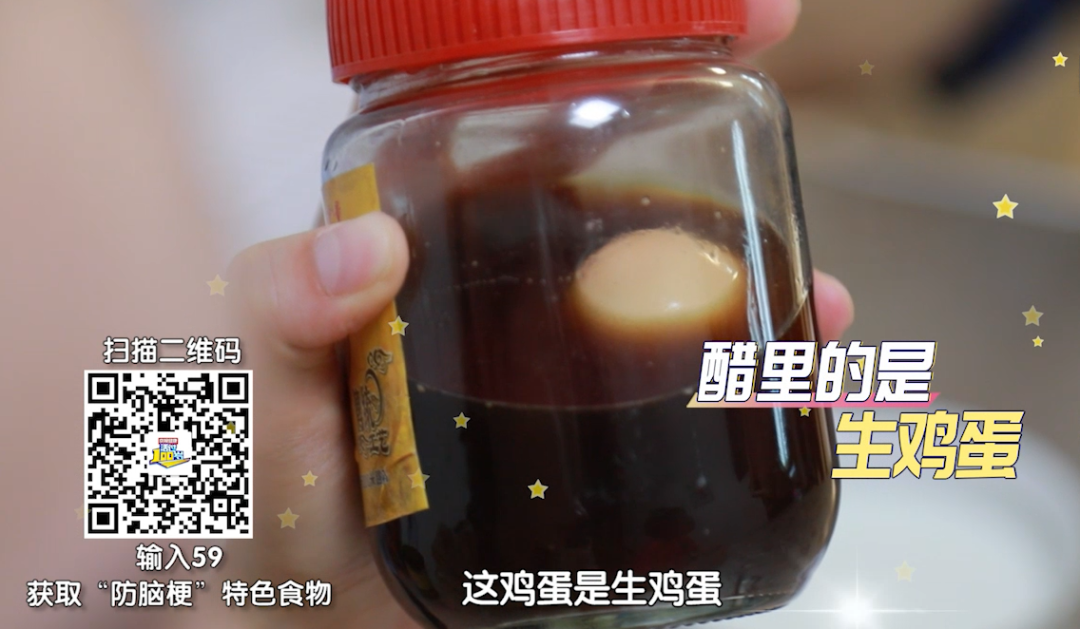 在百岁调查员的追问下,毛爷爷拿出一个玻璃瓶,瓶中黑色的液体竟然是米醋,而其中泡着的是一枚生鸡蛋!原来,毛爷爷坚持食用多年的神秘食物,就是“醋蛋液”。