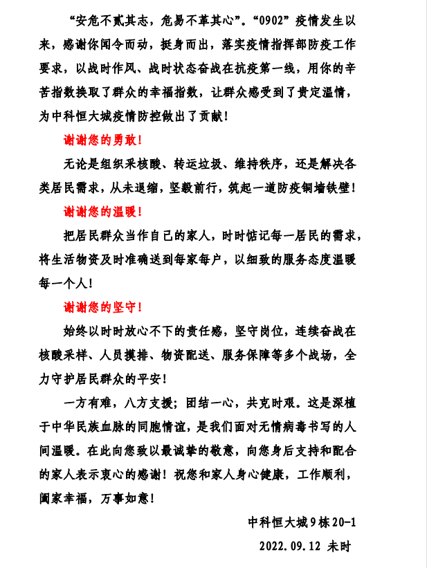 目前,还在管控中的中科恒大城业主罗医生有感而发,感恩在这场疫情中默默付出的所有人,该业主群内业主纷纷表示,感谢信“字句诚恳,有感而发,写出了广大业主的心声,感谢一线工作者、感谢政府工作人员、志愿者无私奉献……”