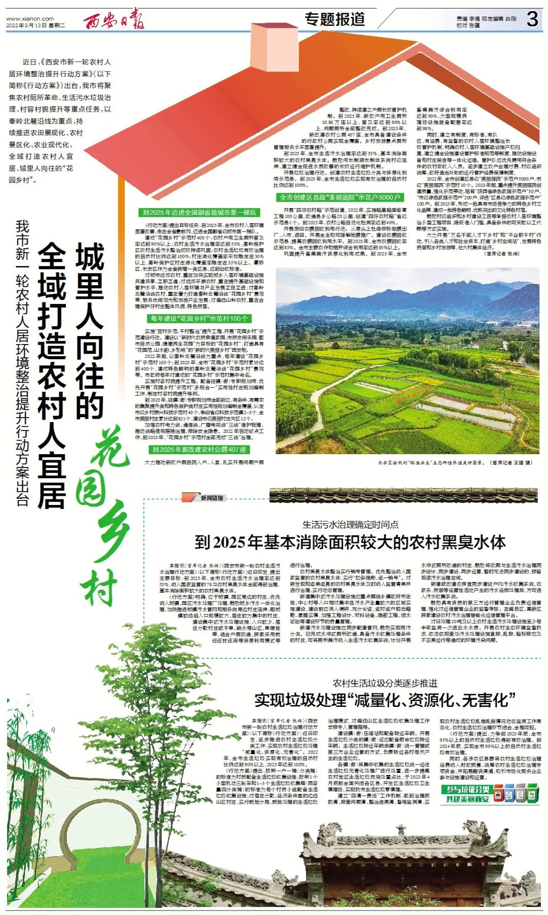 近日,《西安市新一轮农村人居环境整治提升行动方案》(以下简称《行动方案》)出台,我市将聚焦农村厕所革命、生活污水垃圾治理、村容村貌提升等重点任务,以秦岭北麓沿线为重点,持续推进农田景观化、农村景区化、农业现代化,全域打造农村人宜居、城里人向往的“花园乡村”。