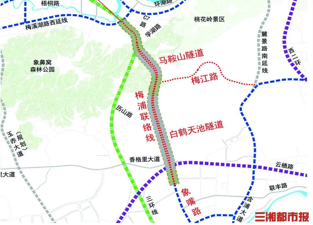 梅浦联络线是湖南湘江新区连接梅溪湖和含浦的南北向“大动脉”,项目北起梅溪湖路西延线,止于含浦片区象嘴路,全长4.45公里。其中梅浦联络线北段(梅溪湖西延线-学湖路)已于2021年完成建设。目前正在建设的梅浦联络线南段设计为双向6车道,北接已建成的梅浦联络线北段,向南延伸与梅江路相交,设置隧道穿越桃花岭景区及白鹤天池山体,以及香格里大道和云栖路,与含浦片区的象嘴路顺接。项目由湘江集团湘新投公司投资建设,由中铁五局和中建五局分两个标段进行施工。