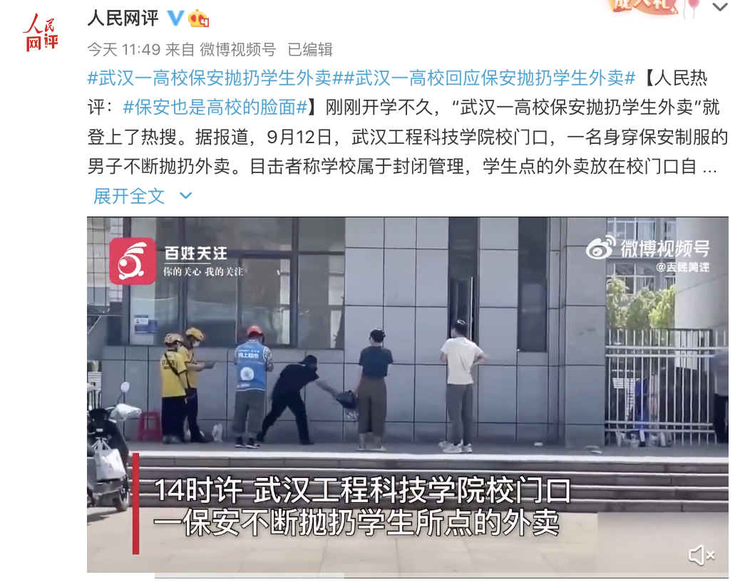 近日,“武汉一高校保安抛扔学生外卖”的消息,引发热议。