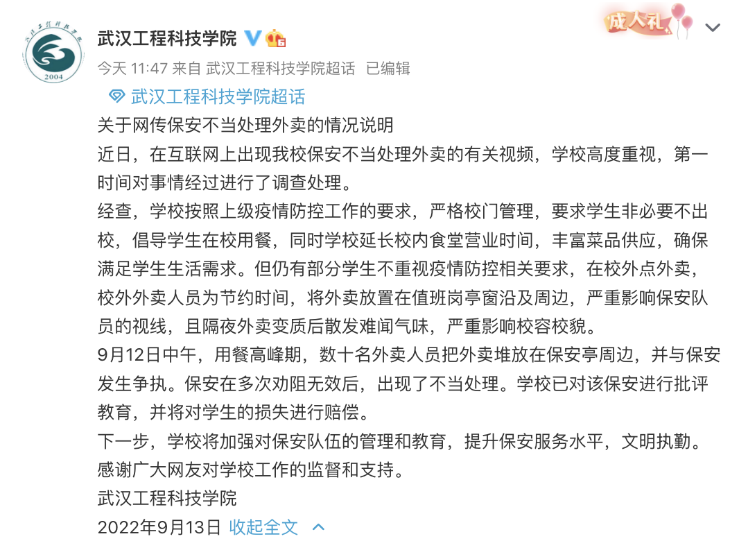 13日中午,武汉工程科技学院发布《关于网传保安不当处理外卖的情况说明》。其中称: