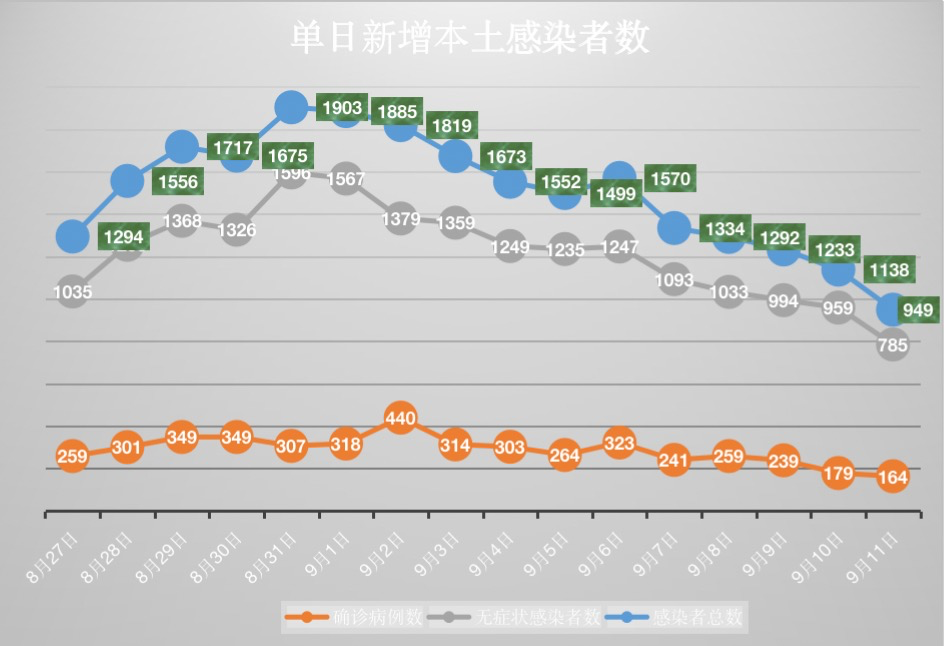 9月6日,本土单日新增感染者共计1570例。自9月7日以来,本土单日新增感染者数已连续5天下降,昨日新增本土感染者数降至千例以下,为949例。