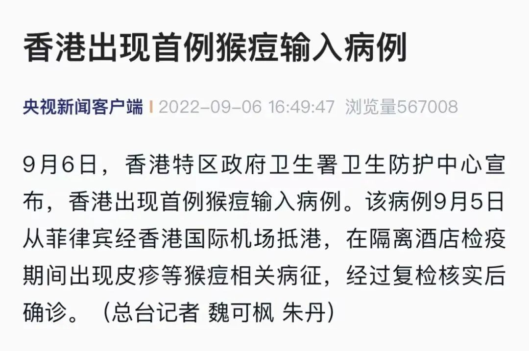 9月6日,香港特区政府卫生署卫生防护中心宣布,香港出现首例猴痘输入病例。该病例9月5日从菲律宾经香港国际机场抵港,在隔离酒店检疫期间出现皮疹等猴痘相关病症,经过复检核实后确诊。