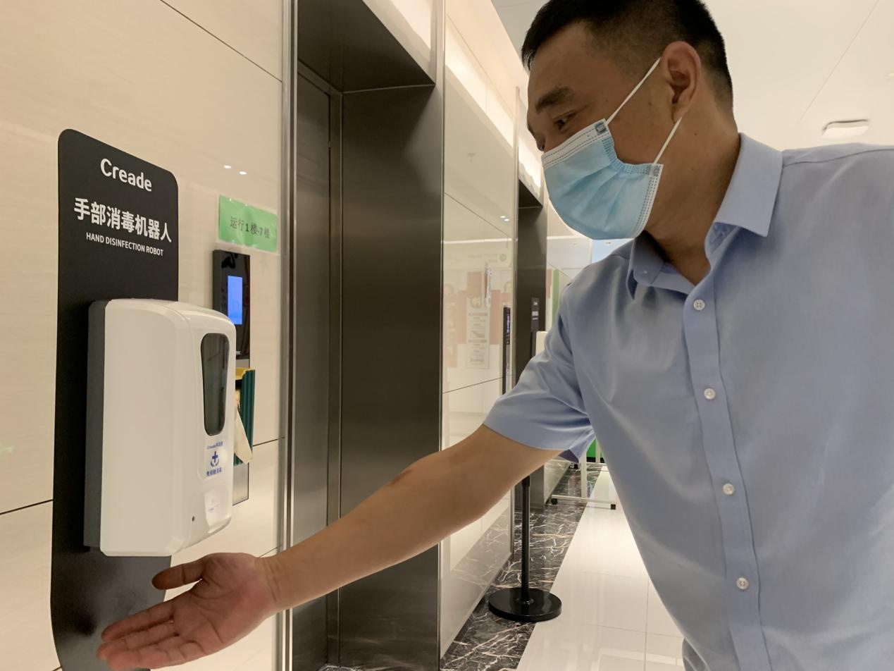陶锴介绍,整个大楼新风系统有专人维护,定期对过滤系统进行更换和消杀。为最大限度防止交叉传染,政务中心在办事大厅、电梯间等转角处,还特意放置了30个手部消毒机器人,随时供人使用。每天晚上整备,有专人负责添加消毒液和更换电池。在工作人员的用餐方面,除坚持“隔位坐”外,还专门实行轮流用餐、错峰吃饭的办法,最大限度减少人员聚集。