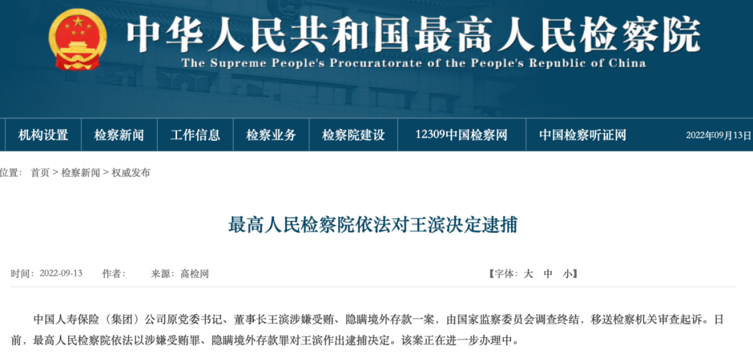 9月13日,据最高人民检察院消息,中国人寿保险(集团)公司原党委书记、董事长王滨涉嫌受贿、隐瞒境外存款一案,由国家监察委员会调查终结,移送检察机关审查起诉。日前,最高人民检察院依法以涉嫌受贿罪、隐瞒境外存款罪对王滨作出逮捕决定。该案正在进一步办理中。