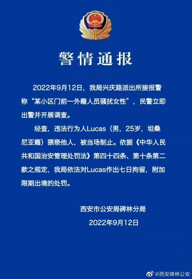 2022年9月12日,西安碑林公安分局兴庆路派出所接报警称“某小区门前一外籍人员骚扰女性”,民警立即出警并开展调查。