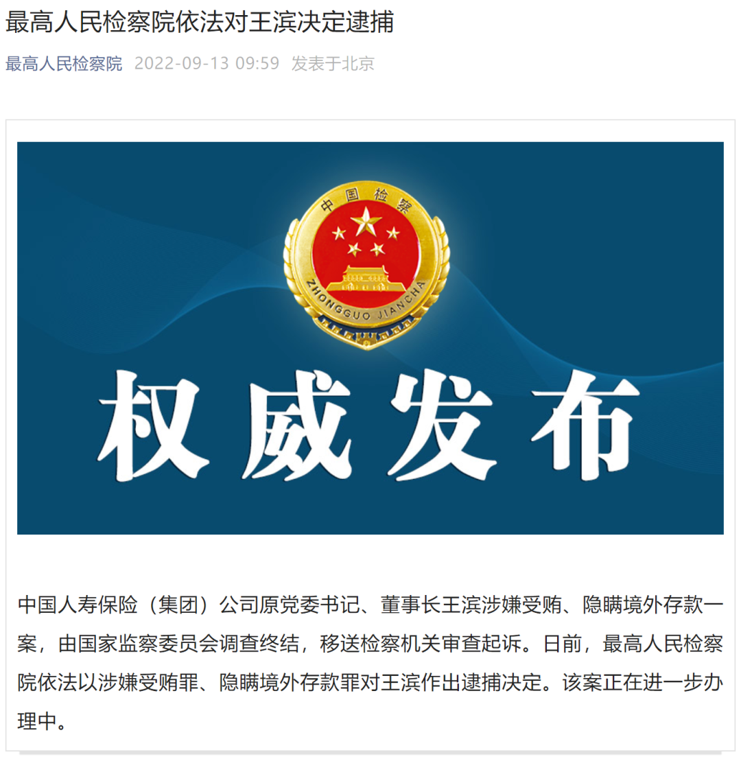 据最高人民检察院微信公众号消息,中国人寿保险(集团)公司原党委书记、董事长王滨涉嫌受贿、隐瞒境外存款一案,由国家监察委员会调查终结,移送检察机关审查起诉。日前,最高人民检察院依法以涉嫌受贿罪、隐瞒境外存款罪对王滨作出逮捕决定。该案正在进一步办理中。