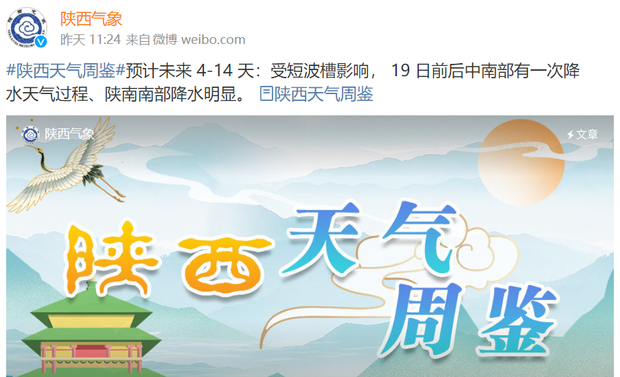 预计未来 4-14 天:受短波槽影响,19日前后中南部有一次降水天气过程、陕南南部降水明显。
