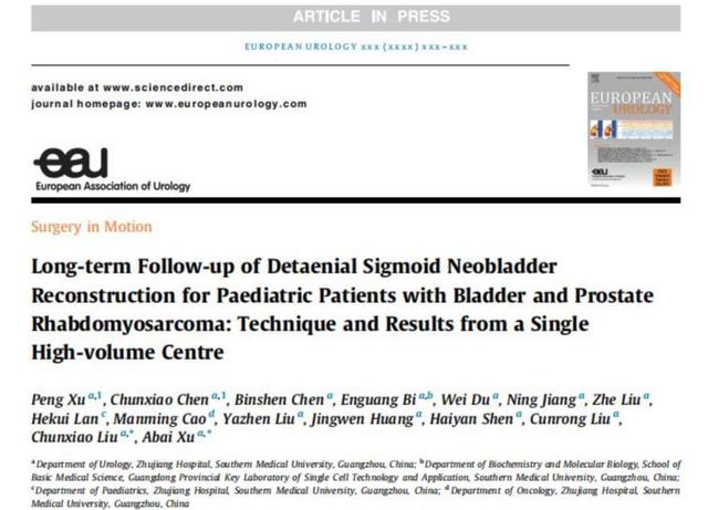 近日,国际泌尿外科界顶级杂志《European Urology》在线发表了由珠江医院泌尿外科刘春晓/徐啊白团队题为《Long-term Follow-up of Detaenial Sigmoid Neobladder Reconstruction for Paediatric Patients with Bladder and Prostate Rhabdomyosarcoma: Technique and Results from a Single High-volume Centre》(小儿膀胱/前列腺横纹肌肉瘤去带乙状结肠新膀胱重建手术技巧及单中心长期随访结果)的临床研究论文。