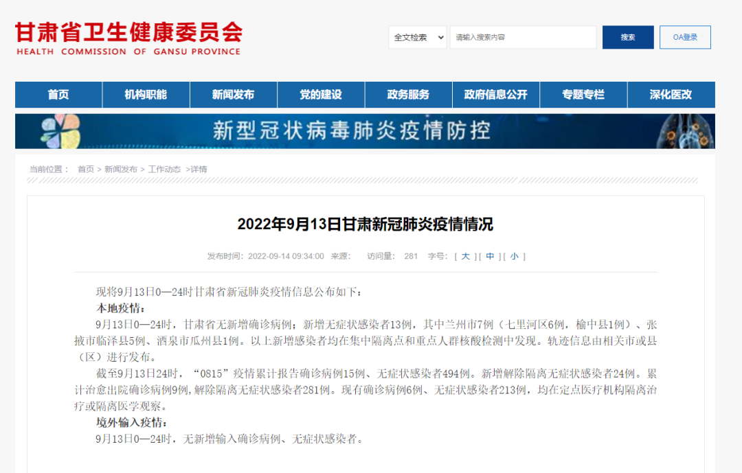 2022年9月13日甘肃新冠肺炎疫情情况