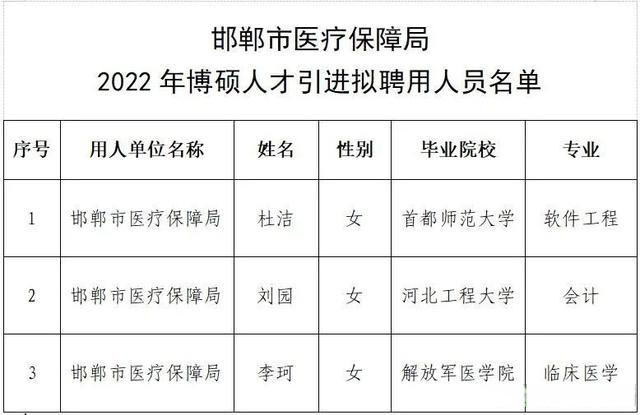 邯郸市医疗保障局2022年博硕人才引进工作经过报名、资格审查、笔试、面试、体检和考察等程序,现将杜洁等3名拟聘用人员予以公示。如对公示人员有异议,可在公示期内反映,反映情况和问题必须实事求是,对线索不清的匿名信和匿名电话,公示期间不予受理。
