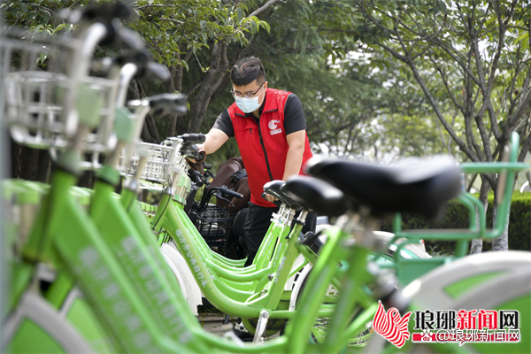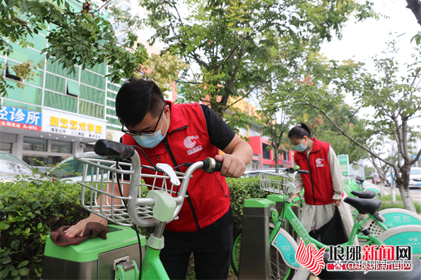 9月13日,在临沂市兰山区柳青街道蒙河路与济南路交会处,市委网信办的青年志愿者在擦拭马路两侧的公共自行车。自文明城市创建工作开展以来,市委网信办分批次组织党员和年轻干部到蒙河路与天津路开展“文明创建我先行”志愿服务活动,主动承担起交通秩序维护、道路清洁、公共设施维护、文明城市创建宣传等工作,提升为民服务意识和本领,助力文明城市创建。(廖杰 陈耿耿 摄)