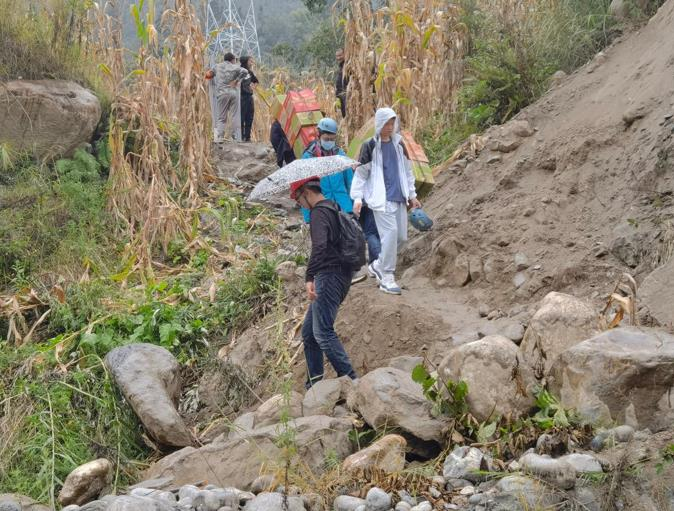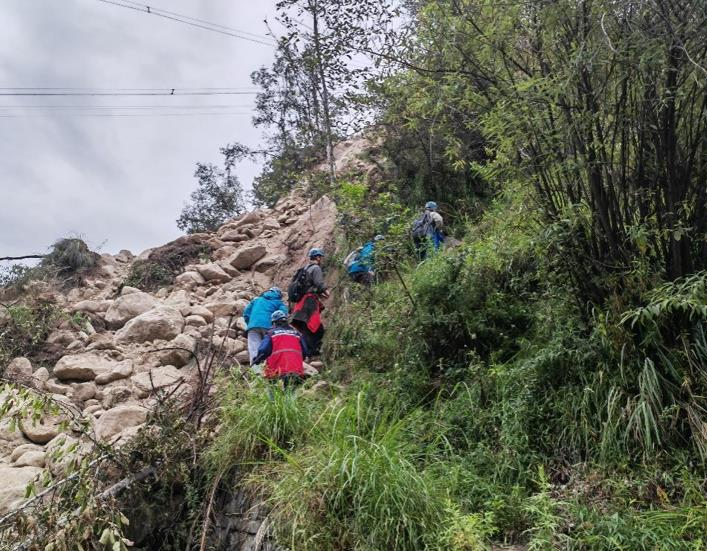 四川省震灾风险防治中心工程地震部部长王世元同志带领的地震现场工作调查第43组是由中国地震局成都青藏高原研究所梁明剑博士和中心新入职的张灿同志三人组成,他们主要任务是从磨子沟镇前往蔡阳村考察地震断层以及震后形成的地表破裂。大震发生后,各种由地震带来的次生灾害频发,外加当地长时间降雨,以致通往蔡阳村的道路被滑坡阻断。王世元一行见道路短时间内无法抢通,为了完成指挥部交代的任务,他们毫不犹豫的选择下车冒着大雨从山上的小路步行挺进前方。他们所要经过的道路上有一座在河流上架设的简易钢架桥,由于震区连降大雨,他们脚底钢管下的河水流速更加湍急,连接桥梁的钢架变得更加湿滑,手握掌握平衡也更加困难,当他们通过时,桥梁部分钢架的连接处竟然出现了松动,他们不怕困难,手牵着手,相互鼓励,坚持通过,用实际行动诠释着地震人的执着。他们用这份执着安全的抵达了目的地,顺利地完成了上级交办的工作任务。