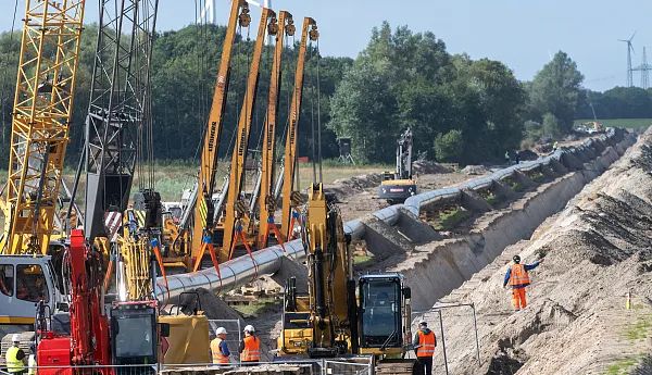 当地时间2022年9月13日,德国威廉港,工人们正在建造一条将天然气从附近新的液化天然气(LNG)终端运输到Etzel地下存储设施的管道。图/视觉中国