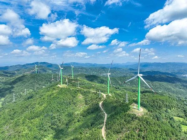 2022年6月23日,在江西省赣州市赣县区沙地镇高峰山风电场,一台台环保节能风电机组迎风旋转与蓝天白云、壮阔林海相映成趣,不停地输送绿色生态电能。图/视觉中国