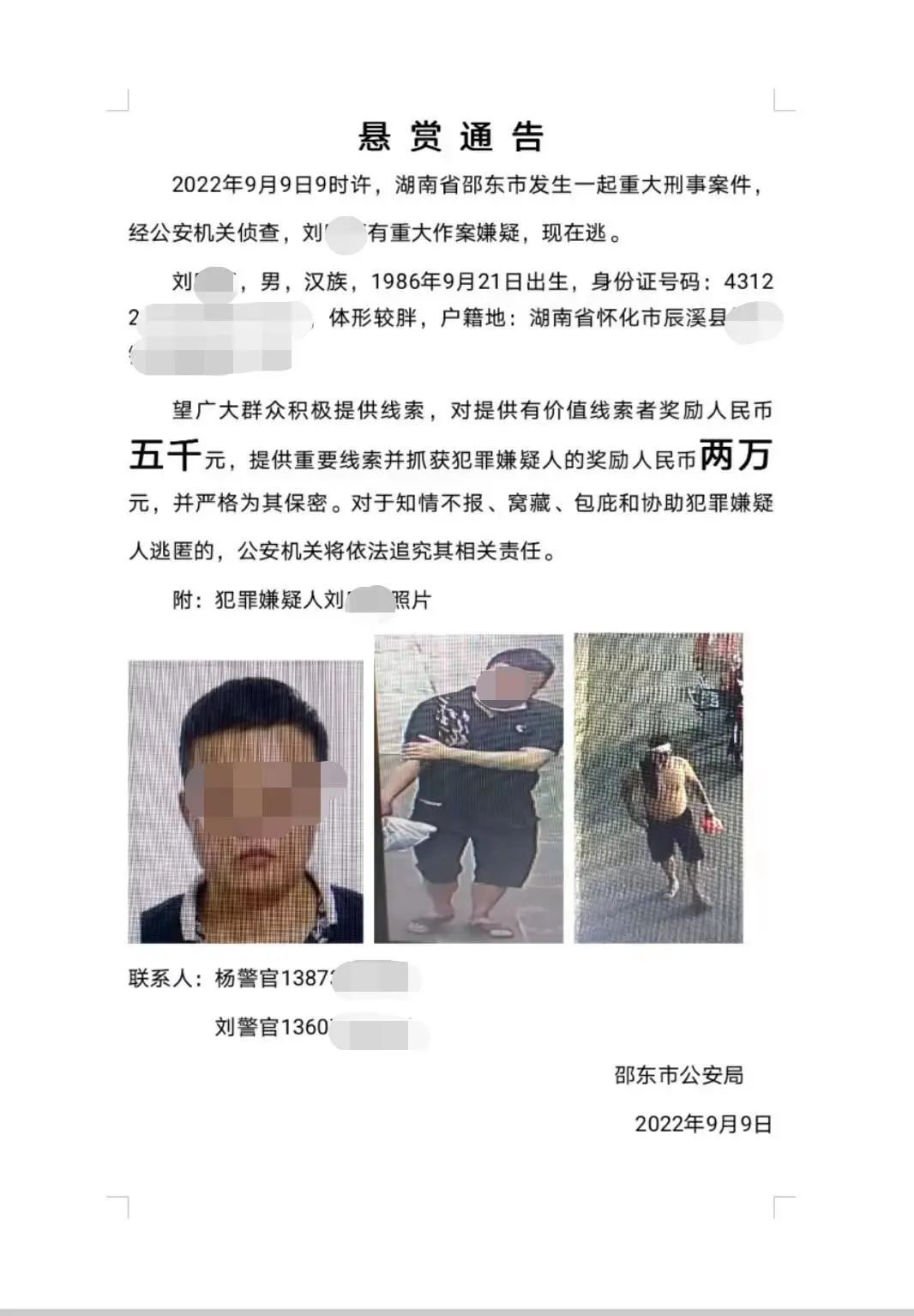 悬赏通告称:2022年9月9日9时许,湖南省邵东市发生一起重大刑事案件,经公安机关侦查,刘某某有重大作案嫌疑,现在逃。