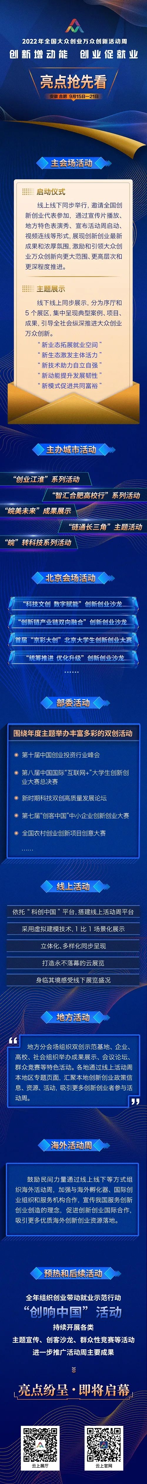 2022年全国大众创业万众创新活动周将于9月15日至21日举行。本届活动周以“创新增动能,创业促就业”为主题,采用线上线下相结合的方式,主会场设在安徽省合肥市,在全国各省、自治区、直辖市及计划单列市、新疆生产建设兵团同步开展。