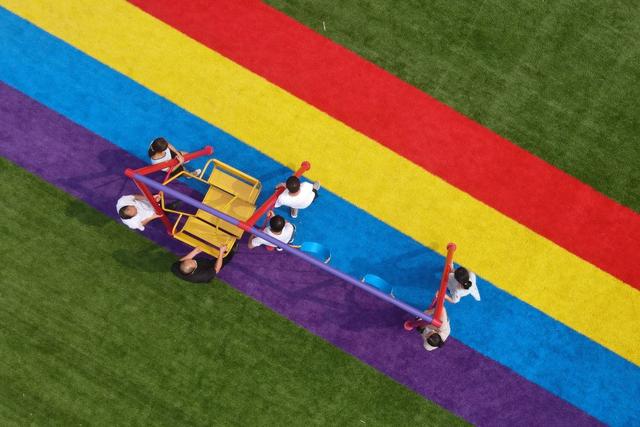 2021年8月17日,河北省沙河市上申庄幼儿园老师在操场上搬运秋千(无人机照片)。2020年以来,河北省沙河市进一步完善学前教育公共服务体系,不断推进普惠性幼儿园建设。新华社记者 牟宇 摄