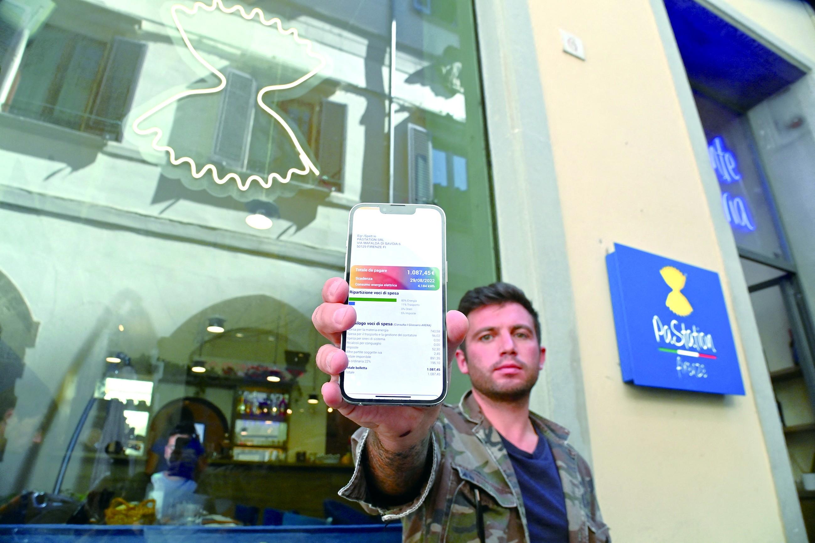 9月10日,意大利佛罗伦萨一餐馆老板在向政府求助时展示了他的账单。这家餐馆的能源成本是一年前的3倍。 (法新社)