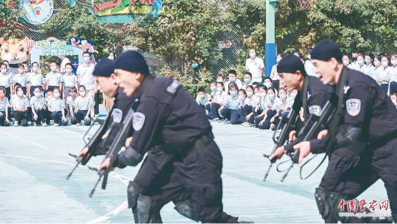 9月9日,北京市西城区反恐办、西城公安分局在辖区学校开展反恐防恐宣传演练活动,为师生带来一堂生动的反恐知识课。图为特警队员展示特战基本技能。陈路坤 摄
