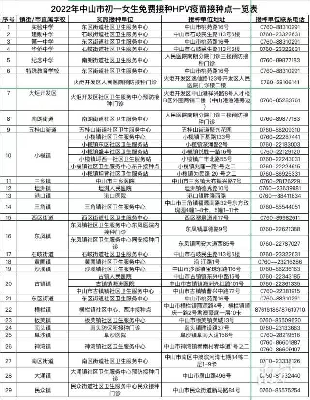 附:2022年中山市初一女生免费接种HPV疫苗接种点一览表