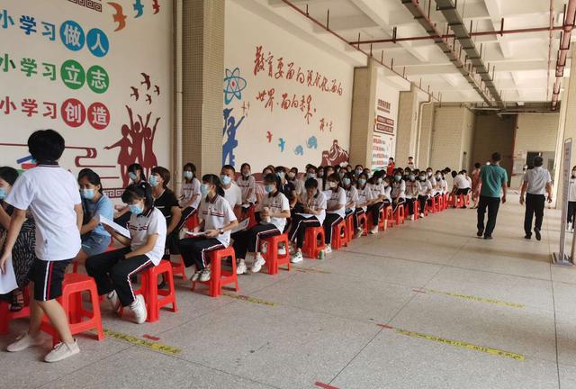 9月14日,在茂名市接种现场——新世纪学校,校内初一级适龄女生于广场集合点集合后,于学校一楼中庭进行预检、登记、接种,随后在现场留观区留观30分钟后方可自行离场。接种工作在现场工作人员、医护人员、学生志愿者的组织中有序进行。