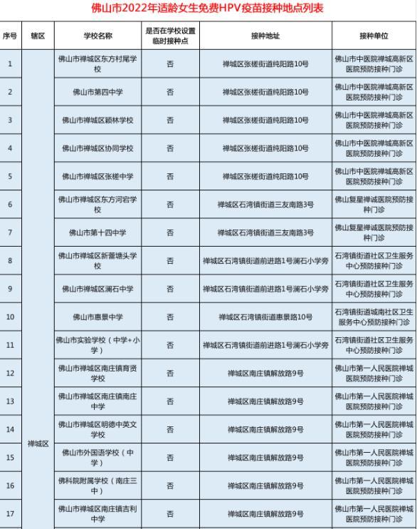 附:佛山市2022年适龄女生免费HPV疫苗接种地点列表(191个)