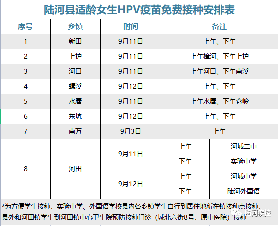 陆河县此前发布适龄女生免费接种HPV疫苗温馨提示:所有学生需在家长陪同下携带预防接种证、身份证或者户口本前往常住地卫生院接种疫苗,疫苗接种时间为9月11日、12日。有发热等特殊原因不能按时接种的学生可于9月17-18日到指定接种点接种。