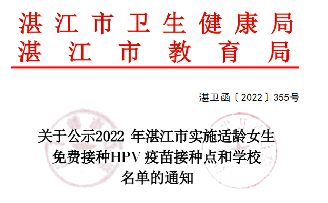 近日,湛江市卫生健康局和湛江市教育局联合发文,公布了2022年湛江市实施适龄女生免费接种HPV疫苗接种点和学校名单。