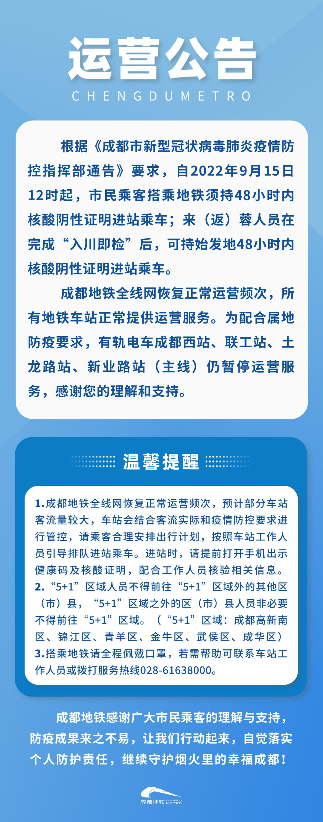 根据《成都市新型冠状病毒肺炎疫情防控指挥部通告》,当前全市疫情防控取得阶段性成效,形势总体可控,平稳向好。除部分区域部分街道外,成都市其他区域自2022年9月15日12时起,逐步有序恢复正常生产生活秩序。成都地铁发布最新运营公告如下:
