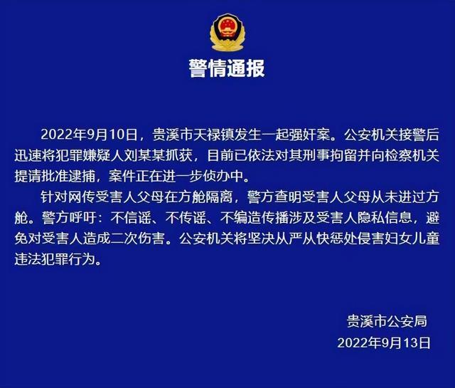 2022年9月10日,江西省贵溪市天禄镇发生一起强奸案,网传信息显示,案件受害人系未成年女童,且事发时父母不在身边。随着各种细节信息逐渐传出,犯罪嫌疑人的无耻恶行迅速激起公愤,舆论对本案的关注也与日俱增。9月13日,贵溪市公安局发布警情通报称:公安机关接警后迅速将犯罪嫌疑人刘某某抓获,目前已依法对其刑事拘留并向检察机关提请批准逮捕。与此同时,针对“受害人父母在方舱隔离”的网络传言,警方也查明受害人父母从未进过方舱。