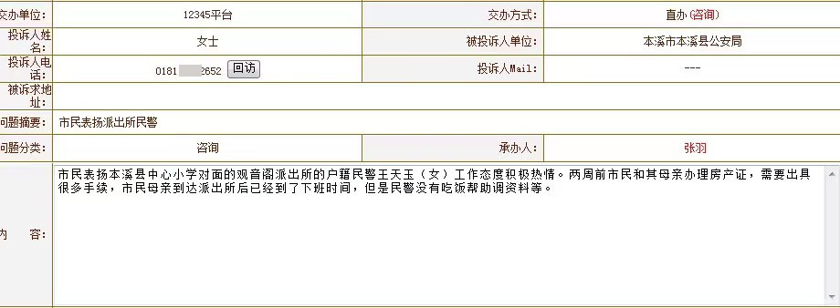“12345”是政府向群众开辟的新型服务平台,绝大多数是协调落实并解决群众网上诉求。然而,本溪县公安局观音阁派出所户籍员王天昱用“枫桥式”的贴心服务,受到了办事群众陈女士在“12345”平台上表扬感谢。