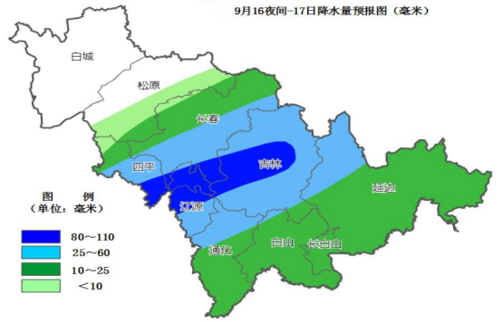 (2)受台风减弱为温带气旋北上影响,16日夜间到17日上午,四平东部、辽源、通化北部、长春东部、吉林大部、延边西北部有大到暴雨,降雨量 25~60 毫米,其中四平东部、长春东南部、辽源个别地方有大暴雨,最大降雨量可达 110 毫米左右。