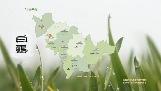 (1)受台风外围倒槽云系影响,15日白天,辽源、通化大部有中雨,降雨量 10~20 毫米,长春、四平、吉林、白山、延边和长白山保护区有小雨,降雨量 3~10 毫米;