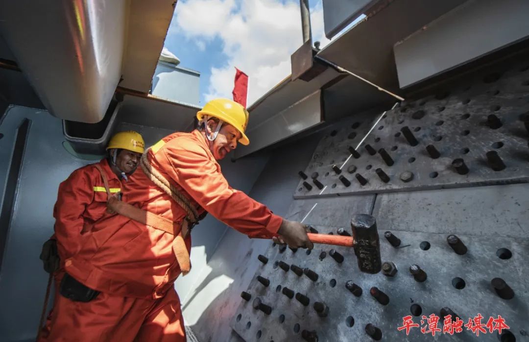 2019年9月25日,大桥主体全线贯通。图为钢桁梁定位完成后,工人在连接板上钉入冲钉,固定桁梁▲