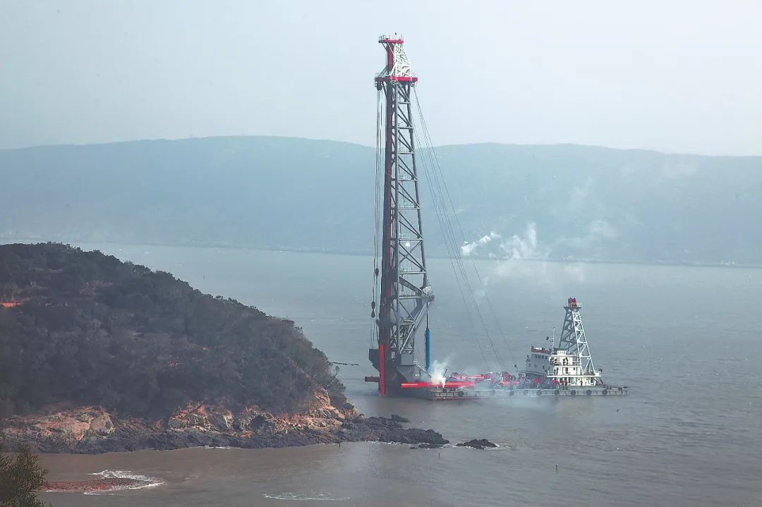 2014年1月18日,大桥海上打桩船首根一米桩试桩成功▲