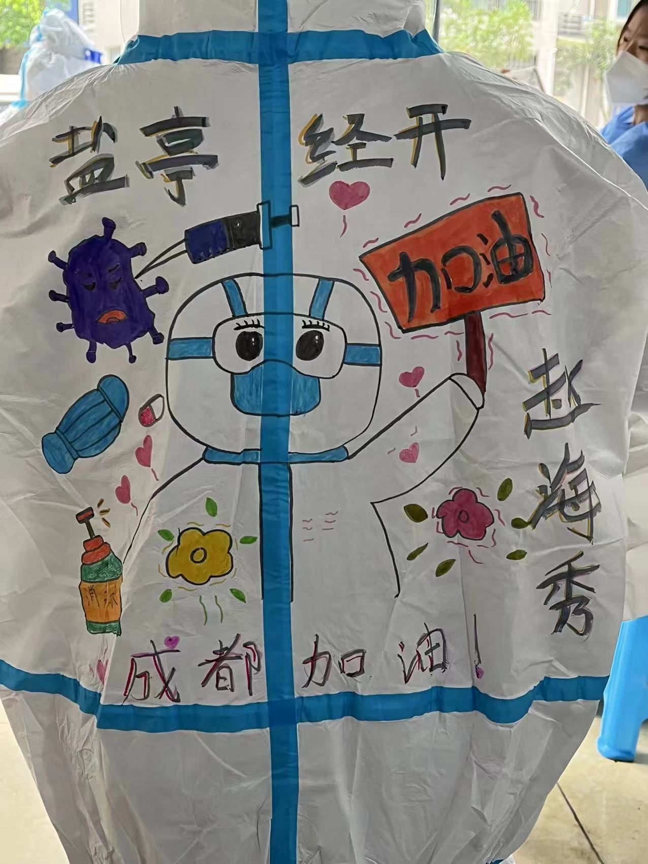 “有些居民喜欢研究我们衣服上画的是什么,他们还会问,明天你们画什么呀?”在她们看来,有了“童趣”的防护服,让前来做核酸的居民有了更多的期待。谢佳说,上班后,因为工作太忙没有时间画画,“没想到这次抗疫,让我重新拿起画笔,做了这样一件有意义的事。”
